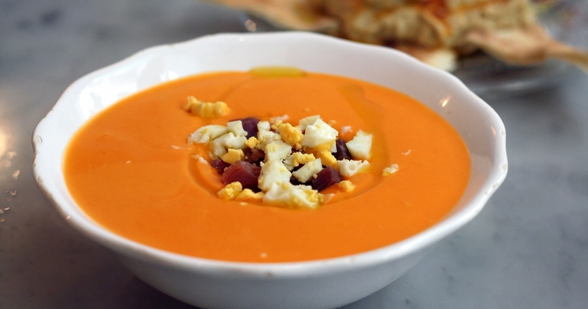 Сальморехо — это традиционный испанский холодный суп родом из региона Андалусия. Он похож на гаспачо, но отличается более густой текстурой и наличием хлеба. Сальморехо — популярное блюдо в жаркую погоду. История: Сальморехо имеет долгую историю, связанную с традициями андалузской кухни. Этот суп появился как способ использования доступных продуктов, таких как помидоры, хлеб и оливковое масло. Традиция: в Испании сальморехо часто подают в качестве закуски или первого блюда, особенно летом. Он освежает и насыщает, что делает его идеальным выбором для жаркой погоды. Существует множество вариантов сальморехо с разными добавками и украшениями. Рецепт (адаптированный для домашнего приготовления): Ингредиенты: Помидоры спелые – 1 кг