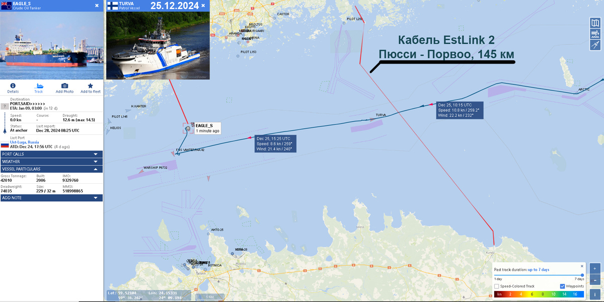 Версия европейских СМИ: судно из «теневого флота» Путина вышло из Санкт-Петербурга, бросило и протащило якорь в месте залегания силового кабеля EstLink 2, тем самым его оборвав. Посмотрим объективные данные. Время будет UTC. Eagle_S входит в международные воды Финского залива в промежуток 7:30 – 10:15, предположим около 9:00. В месте залегания кабеля судно было около 10:15 – 11:00. Скорость 11 узлов. Напомню, что по западной версии, судно тащило якорь по дну и рвало в тряпки бронированные силовые кабели. Судя по дальнейшей скорости судна, контакт с финской береговой охраной (патрульным кораблем Turva, mmsi 230018000) состоялся в 16:56, после чего судно поставили в территориальные воды Финляндии. 28 декабря Eagle S под охраной корабля финской БОХР буксируют в Порвоо, видимо для расследования. Вопрос первый. По расчетам, времени от обрыва кабеля до задержания судна прошло около пяти – шести часов. За это время финны и эстонцы, не самые быстрые ребята на планете, должны были: 1. Выяснить