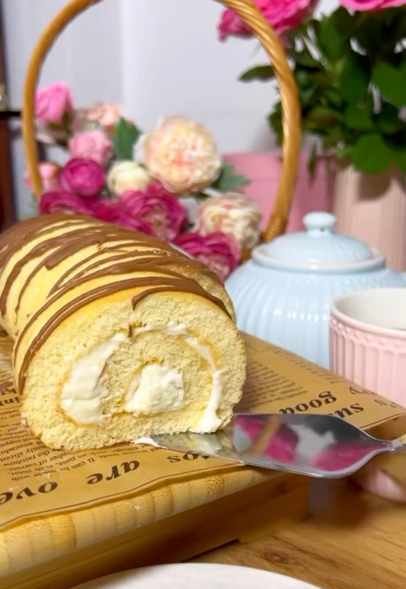 Полить рулет теплой глазурью или шоколадом и украсить по желанию.