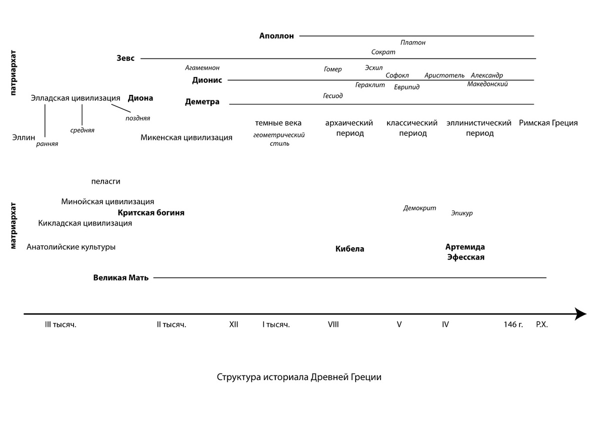 Ярче всего матриархальные мотивы запечатлены в минойской цивилизации, которая в значительной степени повлияла на всю последующую эллинскую культуру. Борьба индоевропейского патриархата с анатолийским и минойским матриархатом составляет нерв ранней стадии эллинского историала — эпохи титаномахии и гигантомахии, растянувшейся на долгие века. Поворотной точкой стало падение Крита, разрушение основных культурно-религиозных центров, городов-храмов и ахейский захват Кносского дворца. После этого наступил микенский период.
