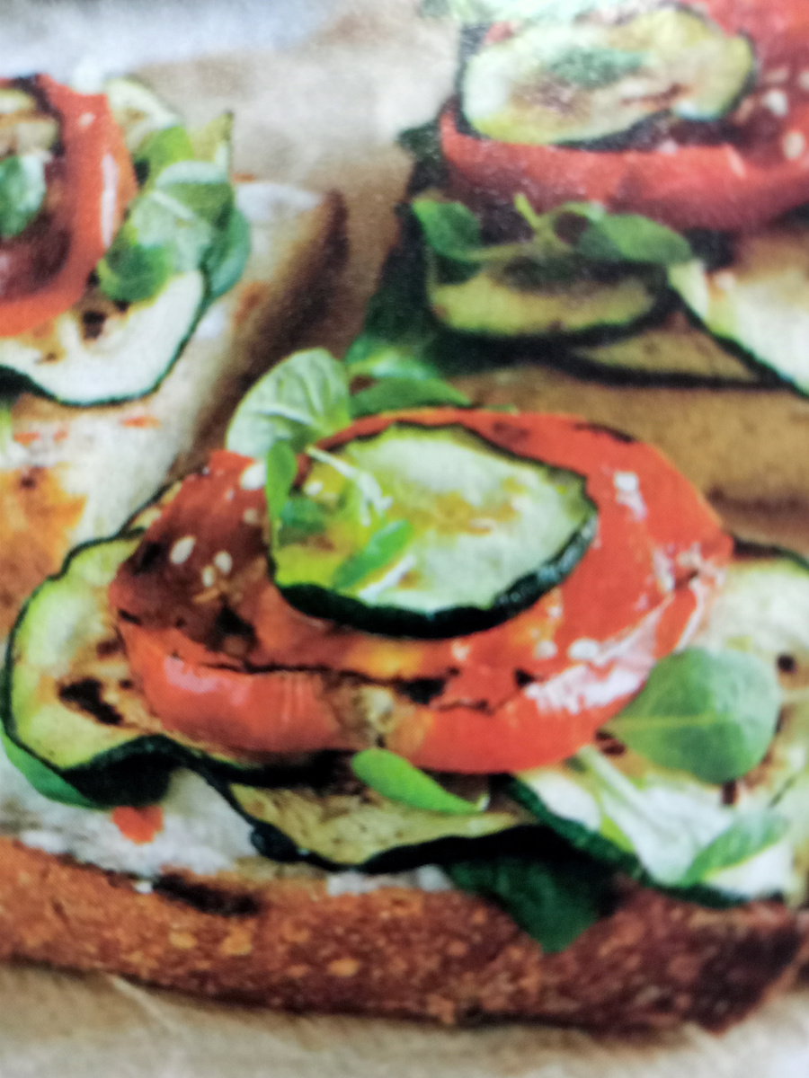 Понадобится 1 багет, 1 кабачок, 1 баклажан , 1 сладкий перец , 2-3 помидора, 100 гр творожного сыра, 2 зубчика чеснока, 2 столовые ложки оливкового масла , смесь итальянских трав, базилик, кунжут,соль, перец.