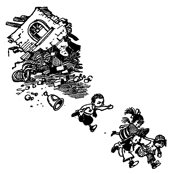 Вокруг затрещало, загремело, загрохотало. Стены комнаты неожиданно рухнули, потолок обвалился, пыль поднялась столбом. На Незнайку сверху что-то посыпалось. Милиционера стукнуло кирпичом по каске, так что в ушах у него зазвенело и он упал. Незнайка недолго думая выскочил во двор. Кнопочка и Пестренький схватили его за руки и бегом потащили к воротам.