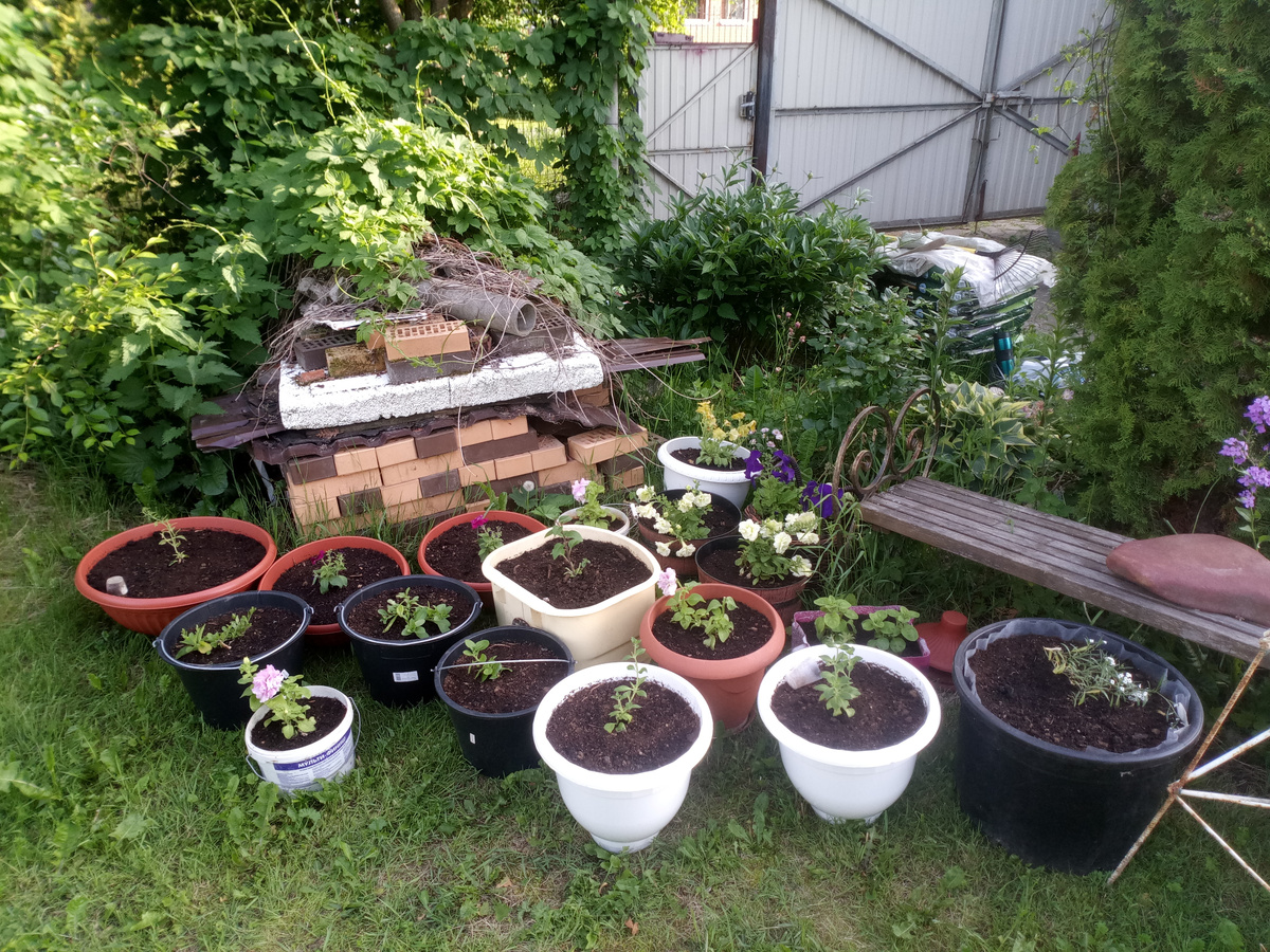 Главной целью плана я себе поставила - высадить все сорта, что нахапала и вырастила за весну. Для этого пришлось закупать бешеное количество кашпо и выискивать дополнительные по участку. Потому как требовалось мне их примерно семь десятков...