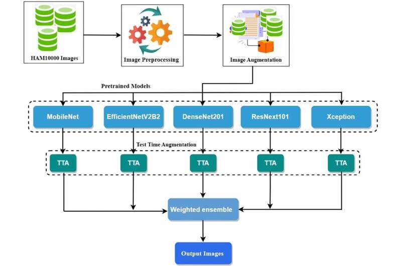 Исследование, проведенное под руководством Алию Тетенги Ибрагима и его команды из Университета Ахмаду Белло, опубликованное в журнале Data Science and Management, представляет собой прорыв в области искусственного интеллекта (ИИ) и дерматологии. Разработанная модель может значительно повысить точность диагностики рака кожи, что может спасти множество жизней. Команда из Университета Ахмаду Белло использовала методы трансферного обучения и увеличения времени тестирования (TTA) для создания модели, способной классифицировать повреждения кожи на семь категорий, включая меланому, базальноклеточную карциному и доброкачественный кератоз. Модель была обучена на обширном наборе данных HAM10000, содержащем более 10 000 дерматоскопических изображений, и достигла впечатляющей точности 94,49%. Ключевым новшеством исследования является использование метода TTA, который искусственно увеличивает набор данных, применяя случайные модификации к тестовым изображениям. Это позволяет модели обобщать широкий