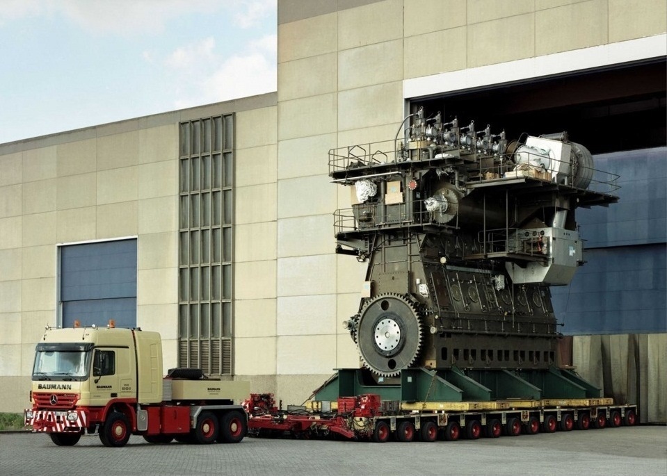 14-цилиндровый Wartsila — Sulzer (Зульцер) 14RTA96-C (таково полное наименование судового дизеля) весит 2300 тонн в сухом виде (без масла и прочих технических жидкостей). Вес коленчатого вала составила 300 тонн. Длина судовых дизелей достигает — 26,7 метра, а высота — 13,2 метра.