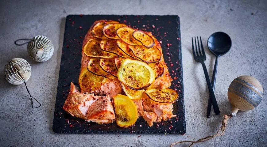Внесите в свою жизнь немного романтики. Это изысканное розовое блюдо станет прекрасным символом любви в новогоднюю ночь. Подавайте его с бутылочкой розового вина, сядьте вместе и загадайте желания. Удалите чешую с лосося, затем приправьте рыбу солью и перцем. Очистите имбирь и чеснок, натрите их на мелкой терке и смешайте с соусом терияки. Разогрейте духовку до 160 °С. Застелите противень бумагой для выпечки и выложите рыбу кожей вниз. Обмажьте рыбу смесью терияки с чесноком и имбирем. Хорошо промойте апельсины и нарежьте их очень тонкими кружочками. Выложите апельсины на рыбу, слегка перекрывая их. Полейте апельсины оливковым маслом и слегка посолите. Поставьте противень в верхнюю часть духовки и запекайте 20 минут. Осторожно обожгите апельсины с помощью горелки, посыпьте их розовым перцем, растертым в пальцах. Подавайте сразу же. Если Вам понравился рецепт, ставьте лайки, подписывайтесь на нас.