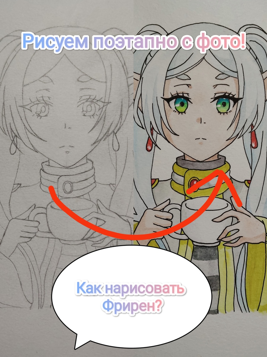 Подготовьте всё необходимое, заваривайте чай и приступайте к этому уроку! Шаг 2 - Нарисуем овал головы и наметим плечи: Шаг 3 - Наметим линиями места где будут располагаться глаза, нос и рот: Шаг 4 - Наметим прямоугольниками размер глаз: Шаг 5 - Нарисуем челку: Шаг 6 - Стираем вспомогательные линии и рисуем макушку головы: Шаг 7 - Рисуем эльфийские ушки Фрирен: Шаг 8 - Рисуем хвостики: Шаг 9 - Дорисовываем линии локонов: Шаг 10 - Переходим к нижней части рисунка и рисуем воротник одежды: Шаг 11 - Рисуем кружку: Шаг 12 - Добавляем линии накидки Фрирен: Шаг 13 - Намечаем линии рук: Шаг 14 - Добавляем объема к линиям и рисуем пальцы: Шаг 15 - Рисуем рукава: Шаг 16 - Добавляем линии на блузке: Шаг 17 - Стираем вспомогательные линии: Шаг 18 - Рисуем наплечники на накидке: Шаг 19 - Оформляем плечи и стираем лишние линии так, чтобы волосы были поверх одежды: Шаг 20 - Переходим к лицу Фрирен и рисуем овалы глаз: Шаг 21 - Рисуем веки так, чтобы они были слегка надвинуты на радужку глаз: Шаг 22