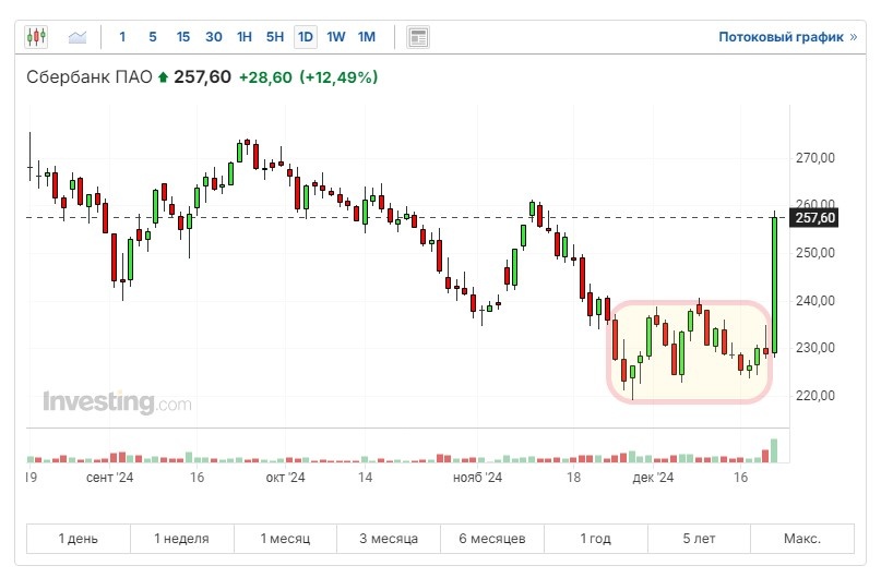 После того как Банк России принял решение сохранить ключевую ставку на уровне 21% рынок акций взлетел так, что отыграл около 4 месяцев предшествующего падения. Все это я уже разбирал в отдельной статье. И вот те, кто покупал акции в последний месяц, пока они были на дне, только за этот 1 день могли легко получить доходность заметно выше 10%, что соответствует полугодовой доходности банковским вкладов по действующим запредельным и, вероятно, уже максимальным ставкам (24-25% годовых). Приведу примеры по конкретным акциям из ТОП-а индекса Мосбиржи, причем будут примеры и хороших, и плохих акций, потому что росли буквально все. Акции Сбера за день подскочили более чем на 12%. На графике я выделил период месяца, предшествующего скачку. Покупая там, по разным ценам, по итогам вчерашнего дня акции можно было бы продать примерно на 10% дороже. Также это можно будет сделать в понедельник при открытии рынка, если кто-то хочет зафиксировать прибыль. Акции МТС за день подскочили еще сильнее - на 1