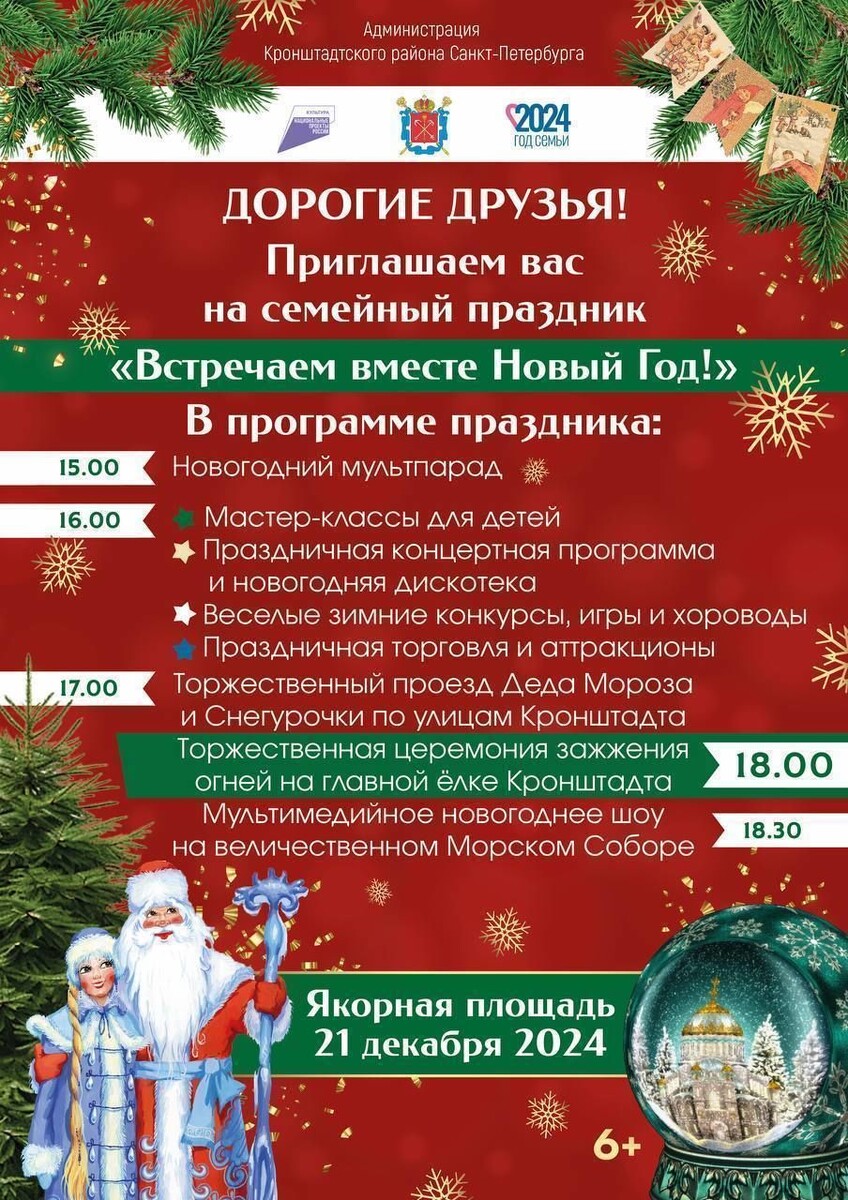 Жителей Кронштадта приглашают 21 декабря на семейный праздник «Встречаем вместе Новый год». Об этом сообщил глава администрации Кронштадтского района Петербурга Андрей Кононов в своем телеграм-канале. Улицы города украшают более 1000 световых элементов, а на Якорной площади установили 20-метровую ель. «С 21 декабря по 8 января Якорная площадь превратится в сказочный зимний лес, в котором вас ждет захватывающее световое шоу на фасаде Морского собора!» – написал Андрей Кононов. Уникальные инсталляции на тему «Рождественские сказки» будут транслироваться каждый вечер с 18:00 до 22:00. А в новогоднюю ночь праздник продлится до 03:00. Ранее «Петербургский дневник» сообщал, что на «Острове фортов» стартует новогодний фестиваль «Зима в Кронштадте».