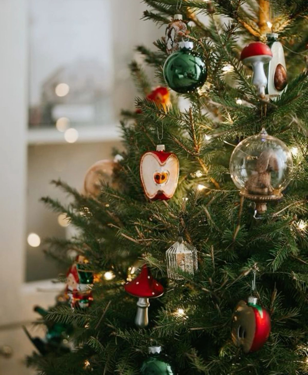 А вот эти стеклянные игрушки мне не приглянулись. У символа года странный цвет и шея, как деревянная. А у мухомора не понятно для чего, добавили синий глиттер на ножку. Получилось черти что.