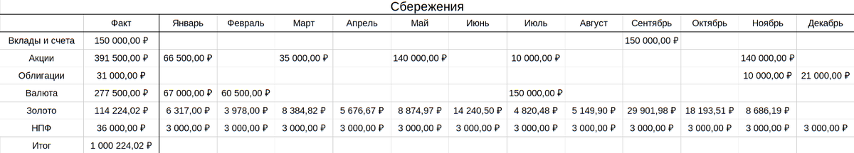 Я не учитываю доходность от инвестиций и перекладывание активов из одного в другой, мне это не так важно, главное что эта сумма отложена/инвестирована, а значит тратить её я уже не буду.