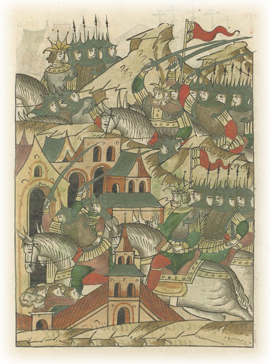 Рис. 5. Противостояние у реки Тихая Сосна в 1501 – 1502 гг. между крымским ханом Менгли-Гиреем (вверху в низу справа) и ханом Большой Орды Шиг-Ахметом (вверху слева). Разгром и распад Большой Орды стал подлинным концом Улуса Джучи, монгольской супер-империи, основанной ханом Бату и занимавшей всю Северную Евразию. Лицевой летописный свод, Москва, вторая пол. XVI в., Шумиловский том, Л. 594, Отдел рукописей Российской национальной библиотеки, СПб.