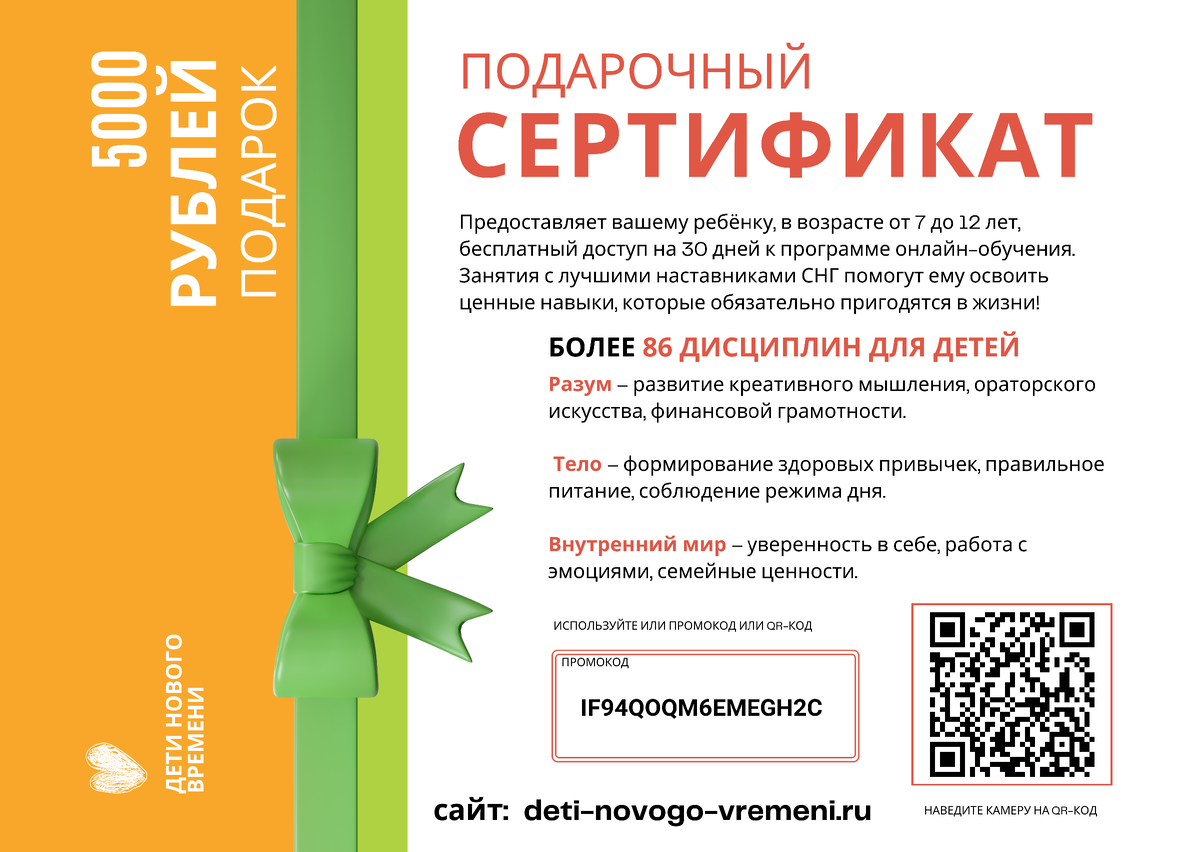 Дорогие родители, у нас есть потрясающая новость специально для вас! Мы подготовили уникальные подарки для родителей детей в возрасте 7-12 лет 🎁 🌟 Мы дарим возможность получить подарочный доступ к онлайн-сообществу "Дети Нового Времени" https://deti-novogo-vremeni.ru номиналом 5000 рублей каждый подарок! Это пространство, где дети развиваются гармонично по трём ключевым направлениям: 🔹 Внутренний мир 🔹 Тело 🔹 Разум 💡 Что ждёт вашего ребёнка? ✔️ Более 86 уникальных дисциплин, в том числе: — Ораторское искусство 🗣 — Развитие уверенности в себе 💪 — Улучшение осанки 🧘♀️ — Конфликтология 🤝 — Столовый этикет 🍽 — Работа с эмоциями ❤️ — И многое другое! Все занятия проводятся лучшими наставниками из СНГ, которые помогут вашим детям не только развиваться, но и находить гармонию с собой и окружающим миром. 🌍 💝 Чтобы получить свой подарочный доступ, наведите камеру на QR-код на фото в этой статье. Если остались вопросы, пришите мне. ✨ Но это ещё не всё! Для родителей в сообществе "