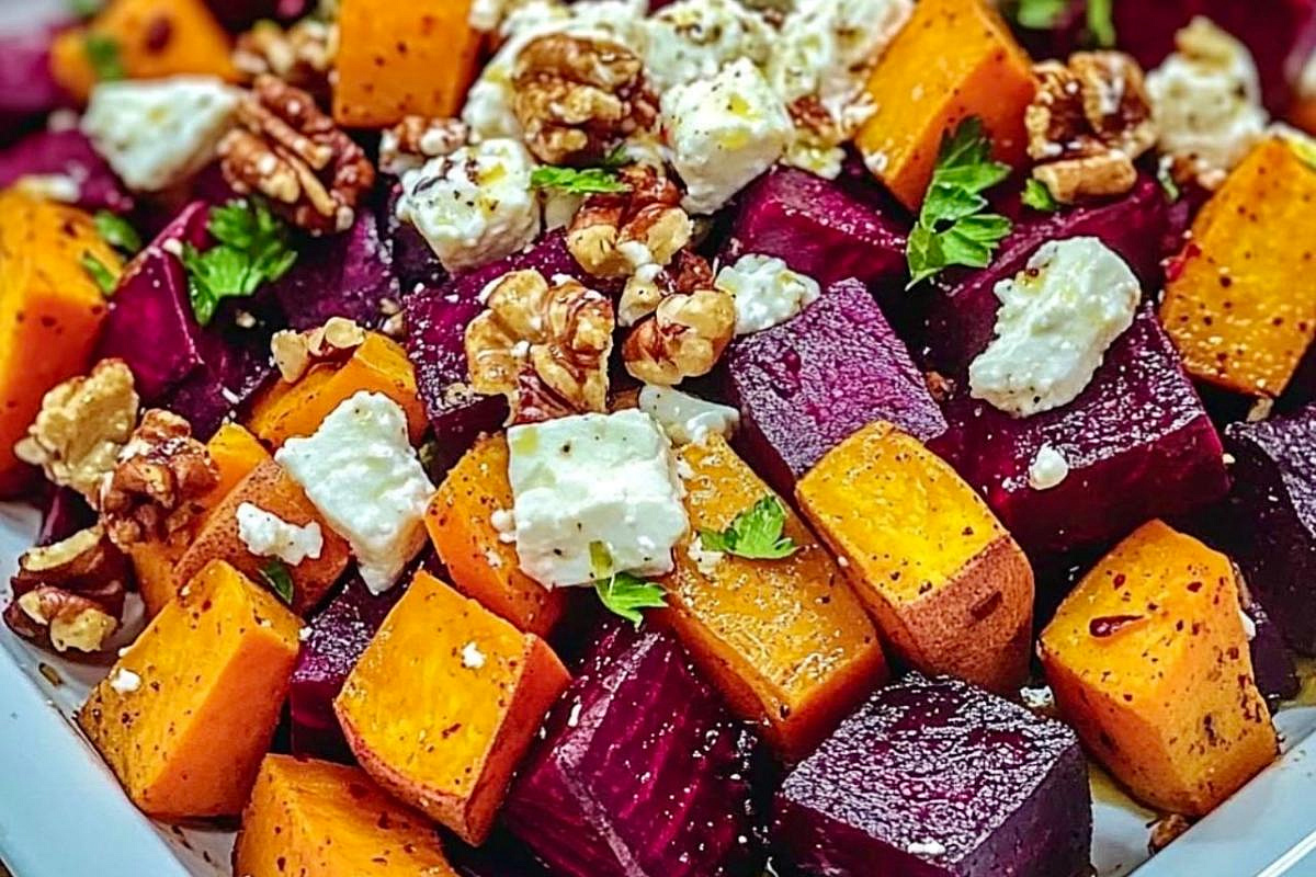 Яркий салат из жареной свеклы и сладкого картофеля с фетой и грецкими орехами Этот салат объединяет сладость жареного картофеля, землистую свеклу, соленую фету и хрустящие грецкие орехи. Он станет идеальным выбором для легкого ужина или дополнением к праздничному столу.