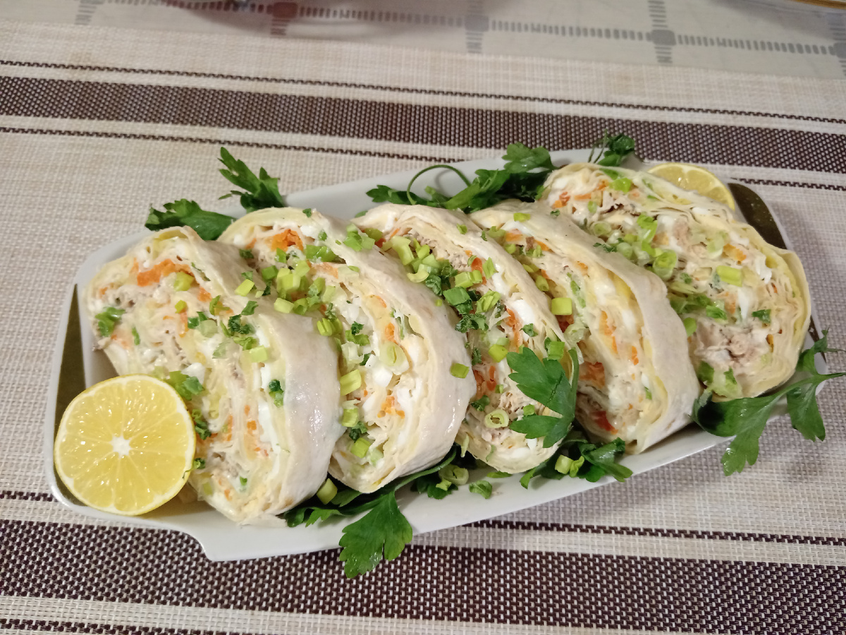 Этот салат очень любят в моей семье. Я готовлю его на все значимые праздники: Новый год, Рождество, дни рождения, годовщины свадьбы... Решила попробовать оригинальную подачу: в лаваше. Рецепт традиционный: Расстелим пищевую плёнку на столе, на него кладём первый лист лаваша, смазываем майонезом и трём туда яйца, слегка посыпаем зелёным луком. Так будем делать каждый слой. Второй слой: Лаваш, майонез, картошка, морковь. Трите прямо из тёрки на лаваш. Присыпьте зелёным луком Третий слой: Майонез, измельченное мясо горбуши, бульон из банки слить. Лаваш оказался коротким, поэтому я подумала что закрутится рулет некрасиво, я добавляю этот лист чисто для аккуратного рулета. Я его положила под низ, промазала майонезом, Натерла оставшуюся картошку. Присыпала зелёным луком. Закрутила без проблем Снаружи промазать сверху майонезом, присыпать зелёным луком. Завернуть в пищевую плёнку. Стоять хотя бы ночь, для пропитки. Вот, прекрасно смотрится на празднично столе! Пробуйте оригинальные