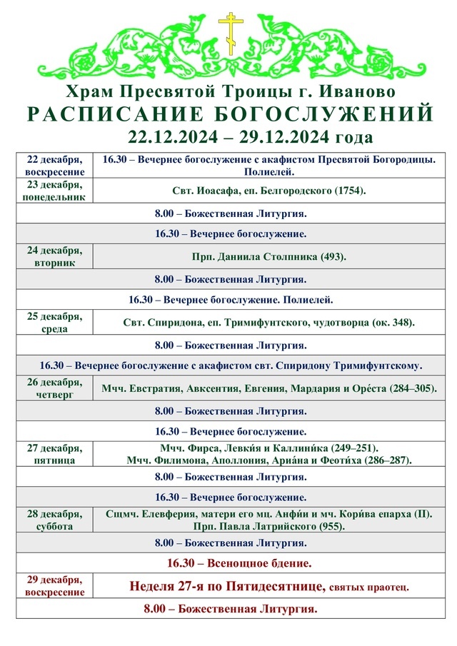 22-29.12. Расписание богослужений в Троицком храме города Иваново