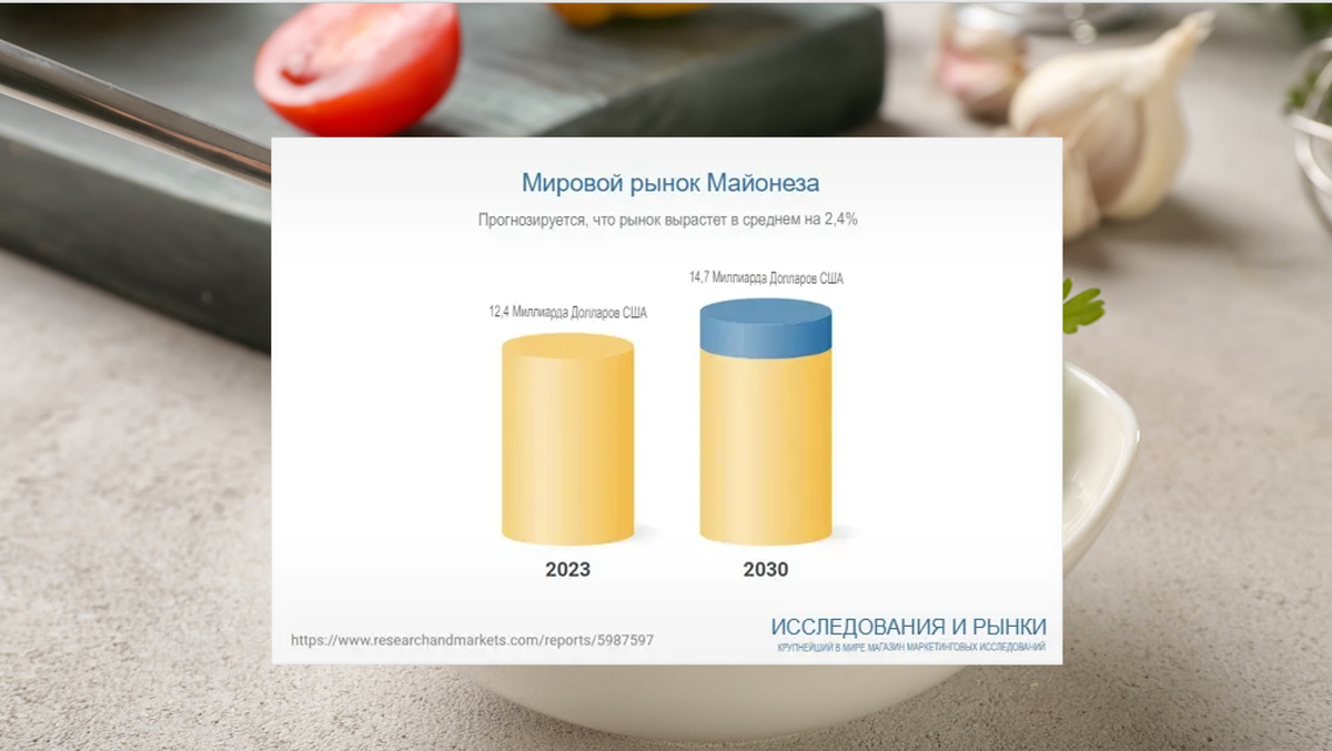 Рынок майонеза показывает стабильный рост, об этом пишет ResearchAndMarkets.com. Оценивая его на 2023 год в 12,4 миллиарда долларов и прогнозируя дальнейший устойчивый рост. Абсолютно поразительно, что поспособствовал этому спрос на здоровое питание, к которому отнесены салаты. Но именно салатные заправки и содержат майонез. И в то же время росту способствует рост рынка фастфуда. Если брать мировой рынок соусов, то 53% на нем занимает именно он — МАЙОНЕЗ!