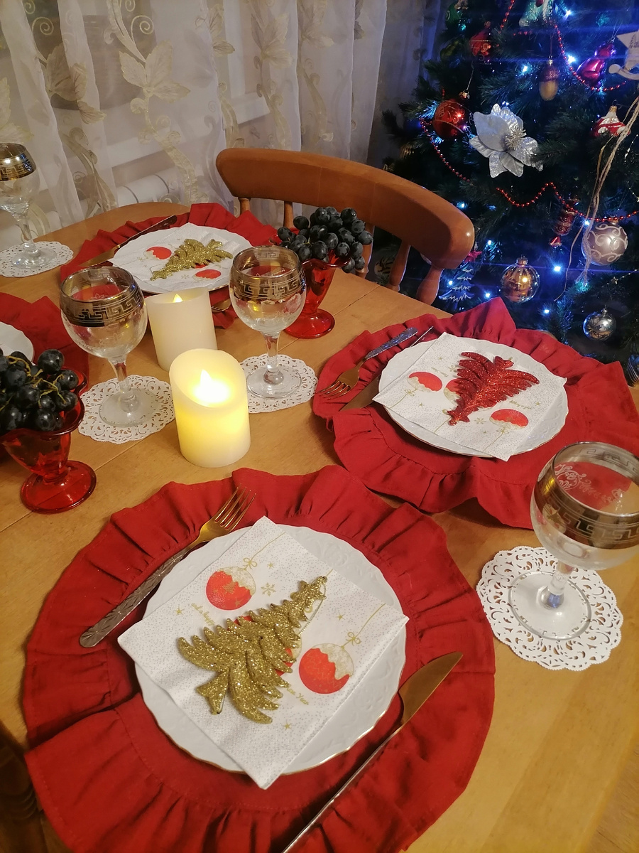 Самое банальное и понятное это использовать красный цвет и имеющиеся у меня красные тканевые плейсматы, мне кажется красный и золотой как нельзя лучше подходят к празднованию нового года и Рождества! В ход пошли креманки для мороженного под виноград, салфетки украсила елочками из Fix Price. Бумажные салфетки в виде снежинок под бокалы добавили как мне кажется настрокния. Ну а свечи добавляют тепла и уюта!