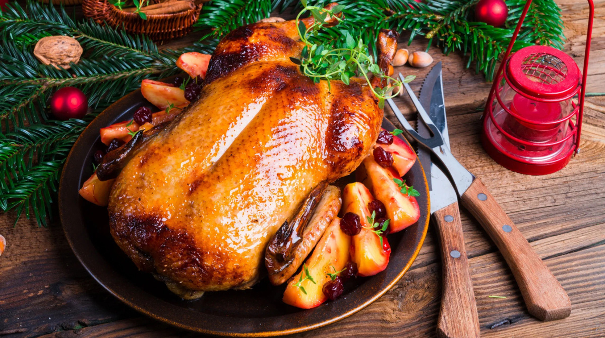 Вот простой и вкусный рецепт новогодней утки: Ингредиенты: - Утка (около 2-2,5 кг) - Соль (по вкусу) - Черный перец (по вкусу) - 2-3 яблока - 1-2 апельсина - 1 головка чеснока - 1 столовая ложка меда - Оливковое масло - Специи (тимьян, розмарин, душистый перец) по вкусу Инструкция: 1. Подготовка утки - Промойте утку под холодной водой и обсушите бумажным полотенцем. - Удалите лишний жир и затем натрите утку солью и перцем как внутри, так и снаружи. 2. Приготовление начинки - Яблоки и апельсины нарежьте на четвертинки. Удалите сердцевину. - Чеснок раздавите. - Начините утку яблоками, апельсинами и чесноком. 3. Маринад - В небольшой миске смешайте мед, оливковое масло и ваши любимые специи. - Намажьте утку полученной смесью. 4. Запекание - Разогрейте духовку до 180°C. - Уложите утку на противень грудкой вверх. - Запекайте в течение 1,5-2 часов, периодически поливая выделяющимся соком. За 20-30 минут до окончания запекания можно увеличить температуру до 200°C для