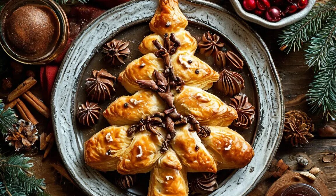 - Выложите скрученные полоски на противень, застеленный пергаментной бумагой, формируя форму елочки. Начинайте выкладывать снизу вверх, чтобы создать видимость ветвей дерева.