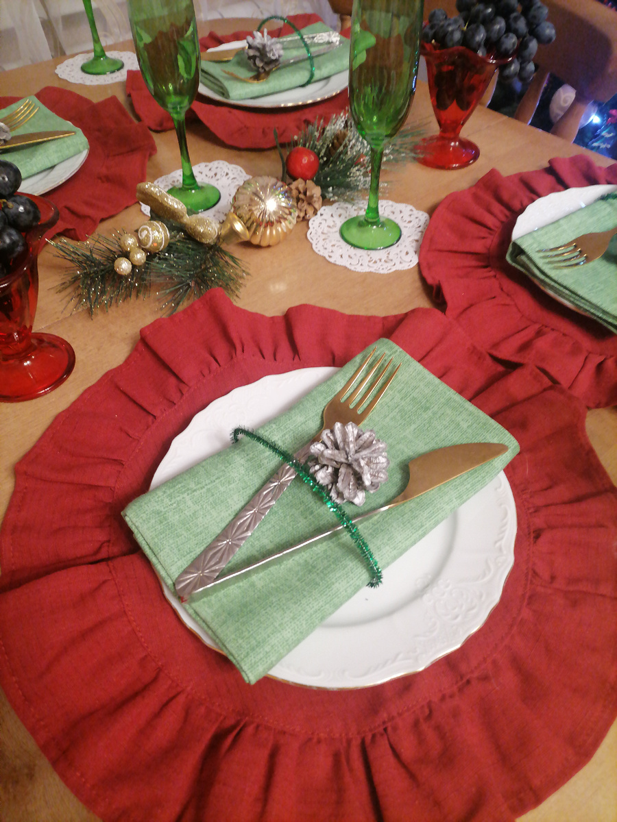 Идея для новогоднего стола с использованием красного и зелёного цветов, для меня лично, она как будто бы в атмосфере праздника в его естественных цаетах! Для ободка над приборами использовала проволоку-мишуру из Fix Price, шишки тоже купленные пару лет назад, использую в разном декор и в осеннем тоже. 🙃 Салфетки и плейсматы тканевые, рогожка.