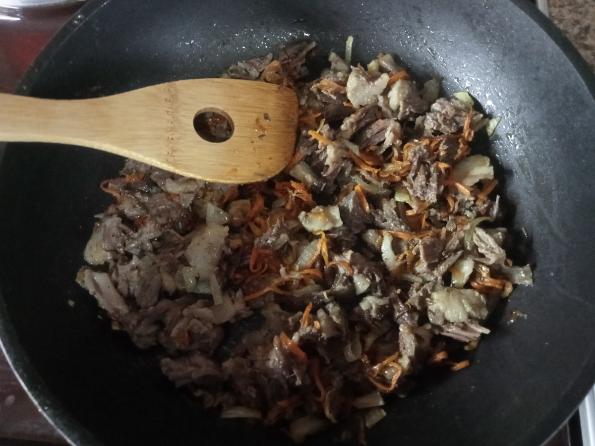 В холодильнике стоял вчерашний бульон из говядины. Предполагалось что это будет рассольник, давненько не варила суп. После посиделок с девчатами из группы танцев не хотелось заниматься готовкой. Однако ужин никто не отменял, хотя пара килограммов к зиме уже добавилась. Сын хвалился пирогами, сделанными из готовых покупных лепёшек. Купила и я такие. Почему-то решила приготовить на сковороде прямо на плите. Достала из бульона варёное мясо, нарезала мелко, добавила морковь, лук и всё это чуть обжарила. Лепёшек в упаковке четыре, но начинки было маловато. Использовала только три штуки. На смазанную маслом сковородку положила одну, сверху часть начинки. Немного присыпала тёртым колбасным сыром Затем ещё одну лепешку. Её пропитала яично- молочной смесью. Распределила остатки мяса. Накрыла третьей лепёшкой, вылила сверху оставшуюся жидкость и опять натерла немного сыра. Жарила под крышкой. Признаюсь, что не рассчитала время и пирог прилично так подгорел. Аккуратно перевернула, перекинув в