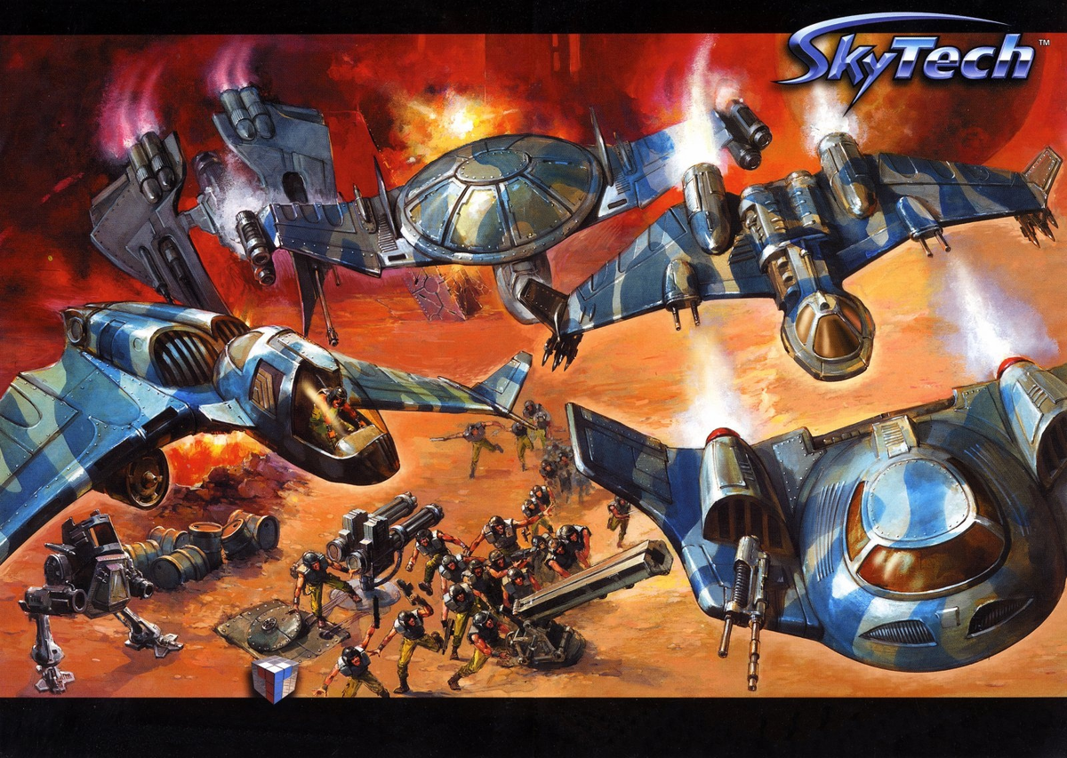 Красивая игра про бои между самолетами (а также ЗРК и боевыми роботами) будущего. Отличные миниатюры и фирменная черта многих игр Технолога: реальная стрельба пластиковыми снарядами. Правда, это только для ЗРК и роботов - самолеты-скайты просто обмениваются ракетными и бомбовыми ударами с карточек. Поле боя тесное, так что схватка протекает довольно быстро и динамично. Правила с виду длинные, но по сути простые. Нормальный скирмиш