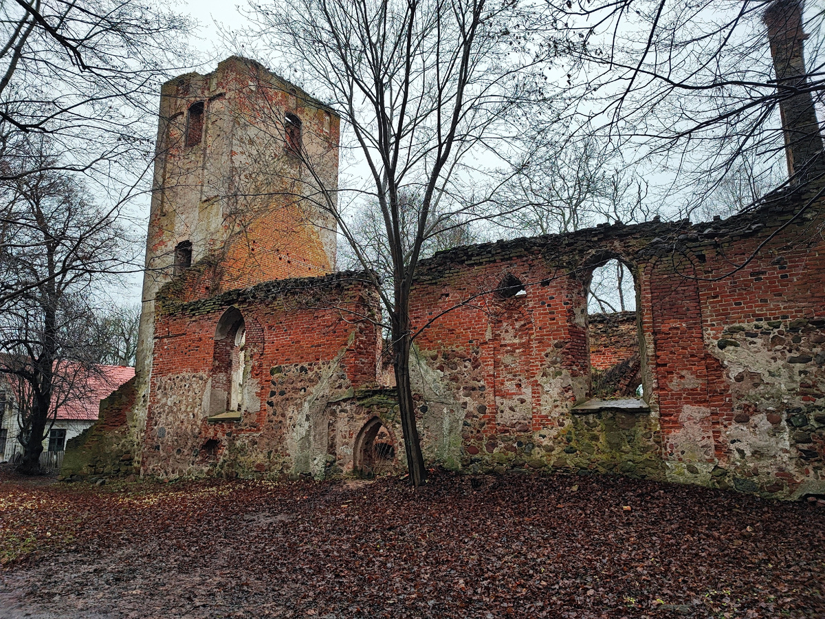 Предыдущей точкой моего маршрута был замок Шаакен. Там, среди мрачных средневековых стен, ко мне неожиданно привязался гид в виде бездомной собаки. Она провожала меня по всем уголкам замка. Видимо, решив, что я нуждаюсь в опеке, мой новый пушистый друг пошел со мной дальше, к следующей достопримечательности — кирхе Шаакен. Скажу честно, первое впечатление от кирхи было двойственным. С одной стороны, величественное готическое здание с вековой историей. С другой — коробка без крыши, которую время и равнодушие превратили в местный арт-объект. Однако, приглядевшись, начинаешь видеть нечто большее. Башня кирхи, хоть и лишилась своего шпиля, все еще держится на своих контрфорсах. Ее стены из валунов и кирпича — как шрамы на коже, говорят о многом: тут молния ударила, там дерево проросло, а здесь кто-то точно пытался оставить автограф. История кирхи начинается в далеком 1280 году. Ее строили рядом с замком, видимо, чтобы рыцари могли быстро пробежать на воскресную службу, не опаздывая