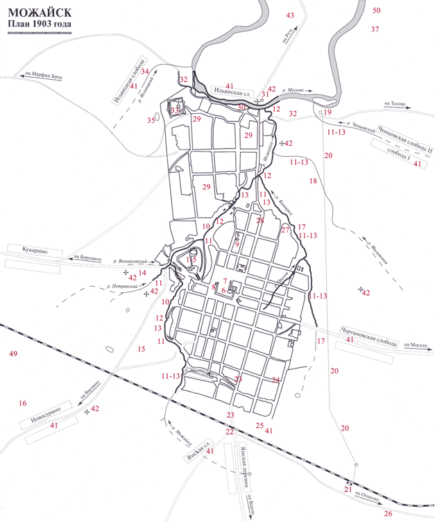 10. «Можайка» – речка Можайка неразрывно воспринимается с древним городом, кремлевским холмом, ее протяженность 3,3 километра. Речка являлась древнейшей градообразующей осью. Существует предание, что эта речка была судоходной. Действительно, высокие берега поймы речки указывают на обильное действие воды. Вырубка лесов, проведенная железная дорога, осушение болота под новые кварталы города остановили приток воды, наполнявший реку. Сегодня это небольшой ручей. По свидетельству очевидца-иноземца Варкоча, проезжавшего через город в 1593 году в Москву, узнаем, что Можайск находился на двух порядочных реках – Москве и Можайке. О полноводности реки в старину говорит найденный на дне якорь высотой с человеческий рост. Письменные картографические источники свидетельствуют о том, что уровень воды в реке искусственно поддерживался с помощью дамбы с мельницей. Ее остатки у спуска от церкви свв. и правв. Иоакима и Анны к Лужецкому монастырю. Исследователь-архитектор Г.Я. Макеев предполагает, что могли быть еще плотины. На западе, в 40 километрах от города, из болот за селом Мокрым начинают наполняться притоки рек бассейна Оки: Москва, Протва и Воря, приток Угры. Можайск находится в близком расположении между реками Москвой и Протвой. Речка Можайка является водной перемычкой между судоходными частями этих рек. Карты XVIII века отмечают притоки Можайки – Волошинский ручей и Волошенский поток. Через них от Можайки проходил в полтора километра древний волок , до Сурина ручья притока речки Мжуть, которая в свою очередь впадала в реку Протву. Сейчас волок пересечён железнодорожным полотном. Природная красота овражного рельефа поймы речки Можайки в старину украшалась обилием церковных глав, крепостных и монастырских построек, с подчиненными им строениями мирского зодчества. Разделенная пополам холмом с крепостью и возвышающимся над ней вратарным храмом, с чудотворным образом святителя Николая, пойма речки воспринималась как гигантский монастырь – монастырь святителя Николая. В Можайку впадают известные сегодня ручьи: Петровский, Каширский, с впадающем в него Ореховым ручьём, Филимоновский. Забытый пересохший Вязниковский ручей впадал в устье речки Петровки, протекал вдоль улицы Бородинской, древней дороги на Вязьму и Смоленск. Так же неизвестный Никольский ручей, впадает в верховья Можайки, начиная свой исток от современных улиц 1-ой и 2-ой Железнодорожной. Назывался он так по находящейся рядом Никольской церкви, в районе ул. Герцена и ул. Красных партизан. Волошенский ручей, впадал ранее со стороны западного склона. Предположительно, место ручья находится под железнодорожной магистралью.