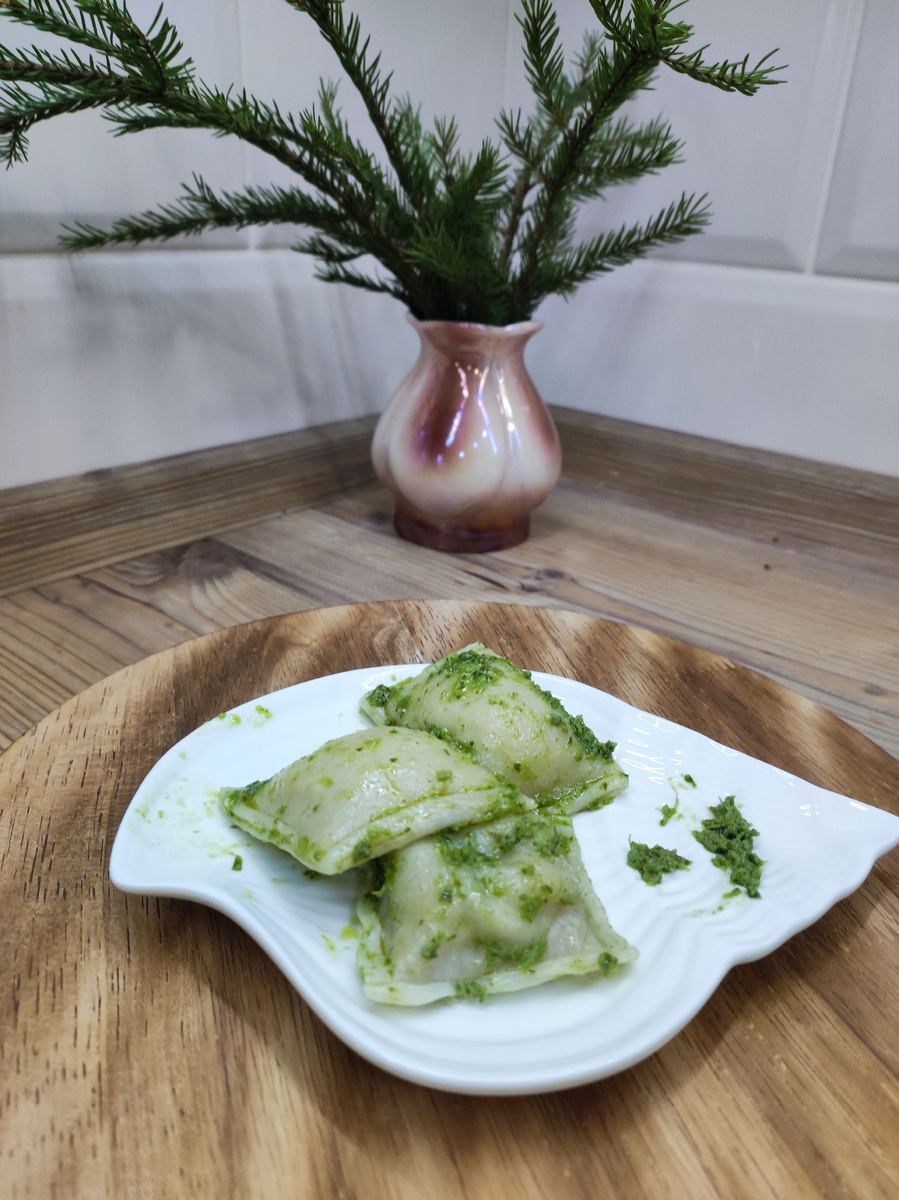 Делюсь с вами рецептом вареников, который покорил сердца всех членов моей семьи и не только. Как сказала моя дочь: "Такие вареники можно запросто подавать в любом ресторане". Тесто: 1 яйцо 1 ч.ложка соли 1 стакан воды (слегка тёплой) 4-5 стакана муки Замешиваем все ингредиенты. Убираем на пару часов под полотенце отдохнуть. Начинка.: Сыр адыгейский Шпинат Соль Сухой чеснок Мускатный орех 1. Шпинат помыть и дать стечь воде 2. Порезать его не сильно мелко. 3. В сковородке немного потушить шпинат на растительном масле. Добавить специи по вкусу. У меня это соль, сухой чеснок и мускатный орех. Выключить. 4. Добавляем в шпинат адыгейский сыр (рецепт сыра смотрите в предыдущих публикациях). Всё хорошо перемешать. 5. Дальше включаем фантазию и формируем вареники. Показываю свой вариант, но на нём не настаиваю. Просто захотелось квадратной формы. Люблю эксперементировать). Раскатываю тесто тонким слоем. Разрезаю полосками 2-3 см. Удобно резать ножом для пиццы. Выкладываем начинку сразу
