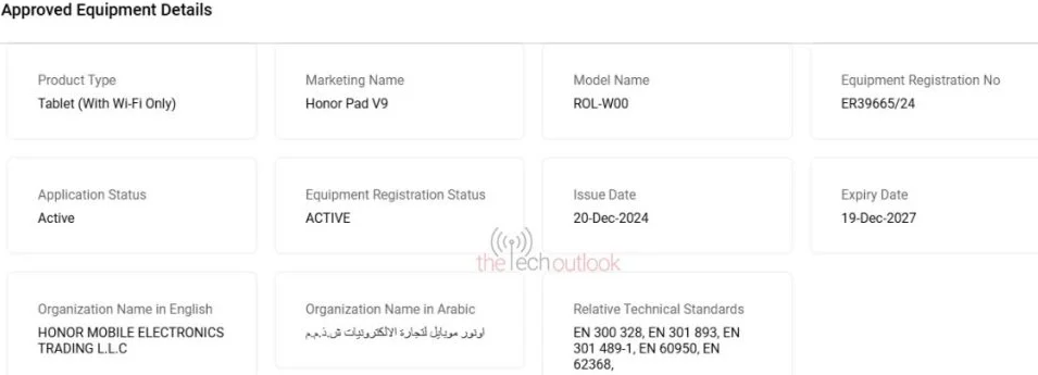 Компания Honor приблизилась к глобальному выпуску своего планшета Pad V9 после его недавнего дебюта в Китае. Устройство имеет номер модели «ROL-W00» и уже получило сертификацию TDRA в ОАЭ, что свидетельствует о его скором запуске в данном регионе. Сертификация, действительная до 19 декабря 2027 года, указывает, что устройство будет выпущено только в версии с поддержкой Wi-Fi. Honor Pad V9 может похвастаться плоским 6,1-миллиметровым сверхтонким металлическим корпусом, весом всего 475 граммов и сертификатом прочности SGS Gold Five Star. Он оснащен большим 11,5-дюймовым дисплеем с разрешением 2,8K, частотой обновления 144 Гц, пиковой яркостью 500 кд/м2 и оптимизацией IMAX Enhanced для улучшенного визуального восприятия. Аудиосистема устройства может впечатлить даже заядлых меломанов благодаря восьми динамикам с улучшенными возможностями IMAX, а также поддержкой пространственного звука и звука высокого разрешения. Эти функции делают планшет Pad V9 отлично подходящим для воспроизведения му