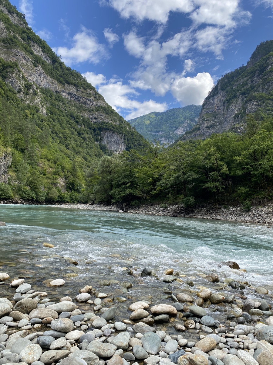 По пути на Рицу нас привлекла река Бзыбь, она завораживает своим цветом, быстротой течения и масштабом в горах. Мы сделали свою первую остановку, чтобы прогуляться по мосту, полюбоваться видами и сделать красивые фото на фоне реки.