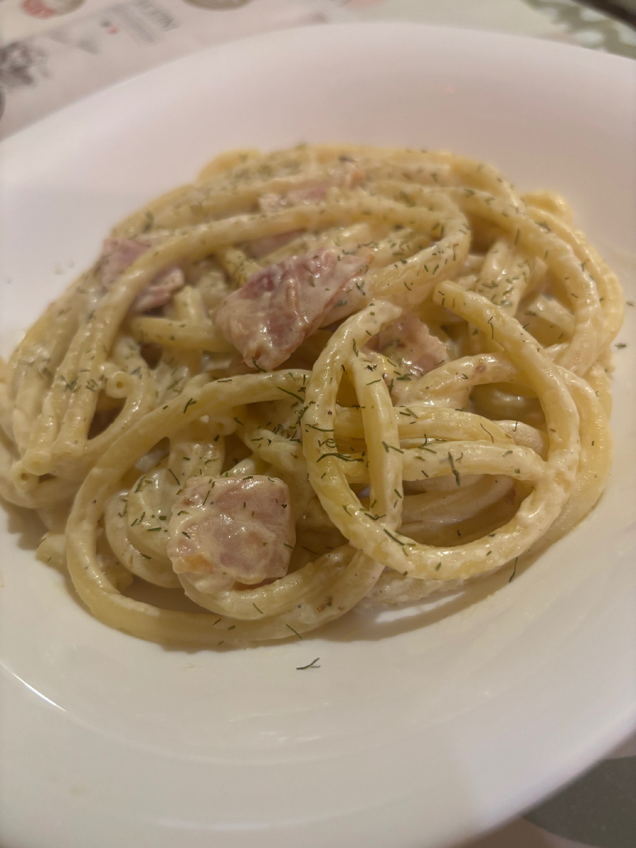 Сколько раз мы готовили классическую карбонару? Не счесть! Но сегодня мы решили немного поэкспериментировать: букатини – с их восхитительной пустотелой структурой – и готовая приправа для карбонары! Увидев букатини, сразу же пришла идея наполнить их нежным сливочным соусом. Любите карбонару? Ставьте лайк! 👍 Что нам понадобится: * Паста Букатини (количество зависит от количества персон) * Бекон сыровяленый (150-200 г) * Сыр примерно 100-150г * Сливки 20% (200 мл) можно использовать 10 процентов. * Приправа для карбонары (следуйте рекомендациям на упаковке) * Свежая зелень (укроп, петрушка, базилик - по желанию) * Соль и свежемолотый черный перец по вкусу Поехали! 1. Отвариваем букатини *al dente* согласно инструкции на упаковке. 2. Пока варится паста, нарезаем бекон небольшими кусочками и обжариваем на среднем огне до золотистой корочки. При жарке добавили немного масла чтобы бекон не подгорел ( если использовать сырой бекон, то масло будет не нужно) 3. В сковороде с бек