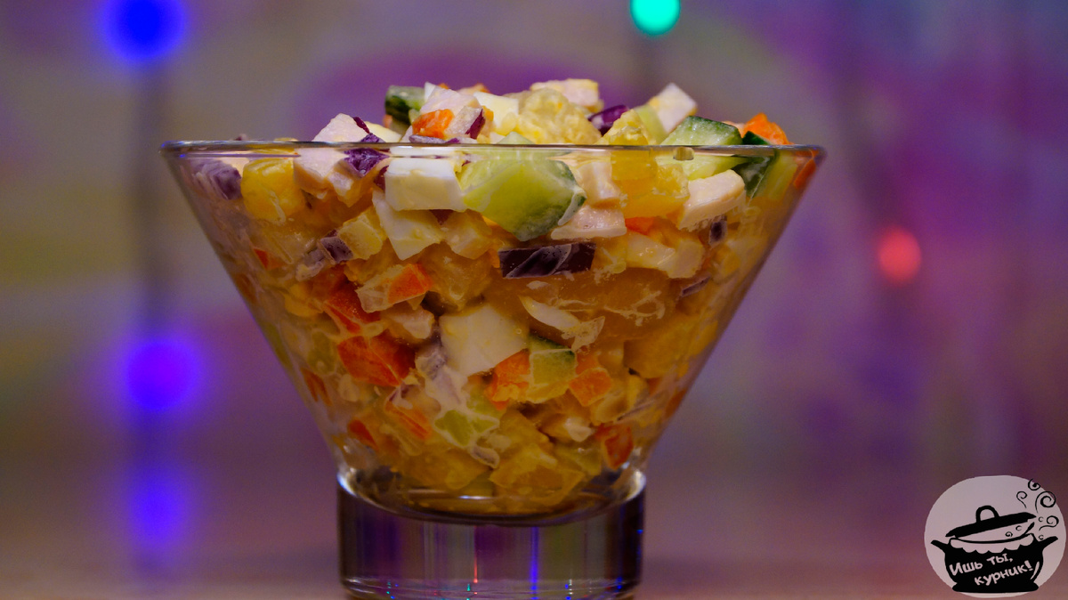 Все ингредиенты порезать мелким кубиком, заправить майонезом и посолить по вкусу.