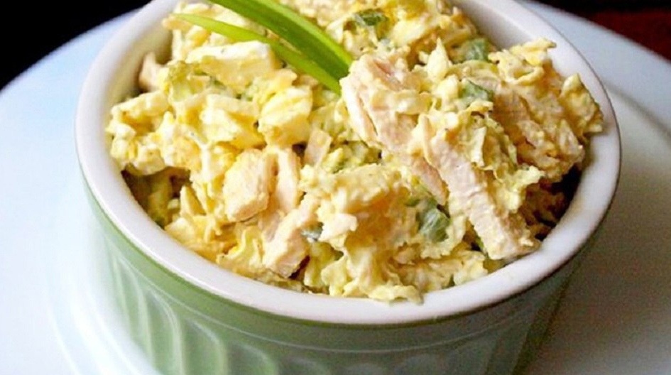Ингредиенты: • Пекинская капуста — 300 г • Куриное филе — 1 шт. • Огурец — 1 шт. • Яйцо — 4 шт. • Зеленый лук — 1 пучок • Соль, перец, сметана — по вкусу Приготовление: 1. Ставим отваривать куриное филе (для аромата добавляем морковку, репчатый лук и лавровый лист. Бульон потом можно использовали для супа). 2. Шинкуем пекинскую капусту. 3. Мелко крошим зеленый лук. 4. Огурец нарезаем соломкой. 5. После того как наше куриное филе отворилось,нарезаем мелким кубиком. А так же отвариваем яйца и крошим их мелко 6. Все выкладываем в салатник, перемешиваем,солим и перчим. 7. Заправляем сметаной и подаём порционно.