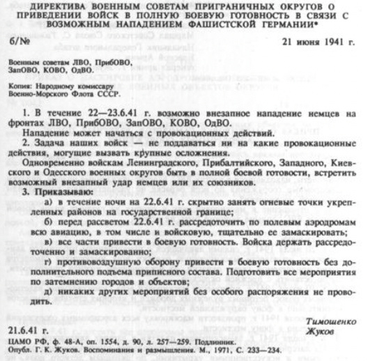 ДИРЕКТИВА ВОЕННЫМ СОВЕТАМ ПРИГРАНИЧНЫХ ОКРУГОВ О ПРИВЕДЕНИИ ВОЙСК В ПОЛНУЮ БОЕВУЮ ГОТОВНОСТЬ В СВЯЗИ С ВОЗМОЖНЫМ НАПАДЕНИЕМ ФАШИСТСКОЙ ГЕРМАНИИ 21 июня 1941 г. Военным советам ЛВО, ПрибОВО, ЗапОВО, КОВО, ОдВО. Копия: Народному комиссару Военно-Морского Флота СССР. 1. В течение 22—23.6.41 г. возможно внезапное нападение немцев на фронтах ЛВО, ПрибОВО, ЗапОВО, КОВО, ОдВО. Нападение может начаться с провокационных действий. 2. Задача наших войск — не поддаваться ни на какие провокационные действия, могущие вызвать крупные осложнения. Одновременно войскам Ленинградского, Прибалтийского, Западного, Киевского и Одесского военных округов быть в полной боевой готовости, встретить возможный внезапный удар немцев или их союзников. 3. Приказываю: А) в течение ночи на 22.6.41 г. скрытно занять огневые точки укрепленных районов на государственной границе; Б) перед рассветом 22.6.41 г. рассредоточить по полевым аэродромам всю авиацию, в том числе и войсковую, тщательно ее замаскировать; В) все части