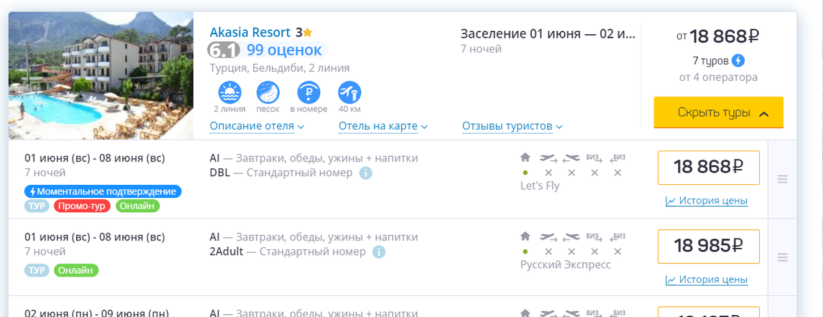 на двоих. Без перелета, медстраховки и трансфера. Это получается, что за сутки проживания всего около 1400 рублей с человека, не забывайте, что и на все включено. В эти 19т.р. входит еще комиссия туроператора и турагента, примерно 2-3 т.р. по максимуму. Можно найти и дешевле, и от 13 т.р на двоих на 7 ночей, но только на завтраках Нам постоянно говорят " всезнающие и вездесущие СМИ" - Отдых в Турции дорожает, турки постоянно поднимают цены, как тут не поверишь , когда посмотришь цены на путевки. Для примера, тот самый простенький отель при стоимости проживания в нем за 19т.р., но уже в пакетном туре - 115 т.р. с вылетом из Москвы, трансфером и страховкой. Это я нашел самый дешевый вариант с перелетом без багажа Простая математика. 115-19=96-2(медстраховка)-4000(групповой трансфер, это я еще по максимуму взял)-10(комиссия турагентства, в реальности меньше) получается 80 т.р. , это как раз стоимость авиабилетов. 40 т.р. - один билет из Москвы до Турции и обратно. А не жирно ли будет? Еще