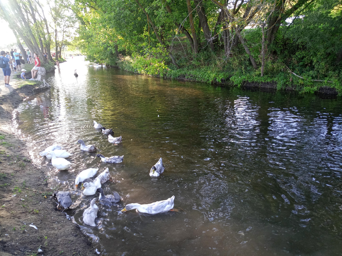 10 августа 2024 г. Дорога идет вдоль речки Каменки. Одно удовольствие прогуливаться по берегу и рассматривать водоплавающих птиц. Мы видели уток, гусей, черных и белых лебедей. Они живут вот в таких деревянных домиках. Речка мелкая и неширокая. Дети любопытные, они стремятся подойти к птицам поближе и пообщаться. На открытых местах речка достаточно живописна, как, впрочем, и многие уголки природы в нашей лесостепи. Вода журчит на перекатах, можно стоять и слушать. За рекой приютились симпатичные деревянные домики, в которых можно остановиться, приехав на Кудыкину гору, к примеру, на пару дней. Вот только цены кусаются. После прогулки вдоль берега реки мы пошли по направлению к Глазному источнику. Он находится на холме. Ориентиры - это возвышающиеся на холме три большие скульптуры Коня, Быка и Петуха. Они сделаны из дерева и имеют форму таких своеобразных причудливых теремов с элементами традиционной русской архитектуры. К Глазному источнику еще предстоит спуститься по ступенькам с