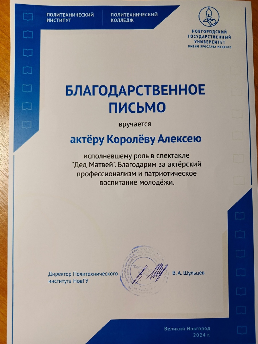 Сегодня нашему театру "Елена Есенина" и всему актерскому составу было вручено благодарственное письмо от Политехнического колледжа за наш последний спектакль "Дед Матвей". Это было неожиданное, но приятное событие для нас. Руководитель театра, Елена Есенина, получила это почетное признание за нашу работу и творческий подход к постановке спектакля. Мы очень рады и гордимся этим признанием, которое стало возможным благодаря нашей команде и нашему таланту.