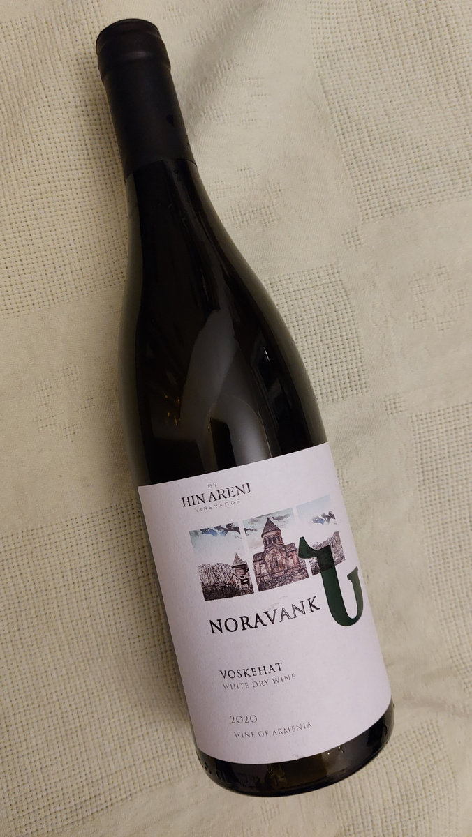 Вино HIM Areni я попробовал одним из первых среди армянских вин и оно меня не то что порадовало, а восхитило. Не удивительно, что цена на него теперь в среднем около 2500, хотя я покупал кратно дешевле. Сегодня же я расскажу про более бюджетную серию вин этого производителя, а конкретно про белое сухое вино Voskehat Noravank. Вино живёт в бургундской достаточно прозаичной темной бутылке. На основной этикетке изо ражен древний монастырь. Нораванк (арм. Նորավանք, в переводе с армянского «новый монастырь») — армянский монастырский комплекс, построенный в XIII—XIV веках в 122 км от Еревана, на уступе узкого извилистого ущелья притока реки Арпа близ села Арени. Ущелье славится отвесными красными скалами, возвышающимися за монастырем, на территории которого расположена двухэтажная церковь Сурб Аствацацин с узкими консольными лестницами. Этикетка не совсе моьычная, оттого достаточно интересная. Колпачок бутылки выполнен из пленки, укупорена бутылка небольшой пресованной noname пробкой. Вино м