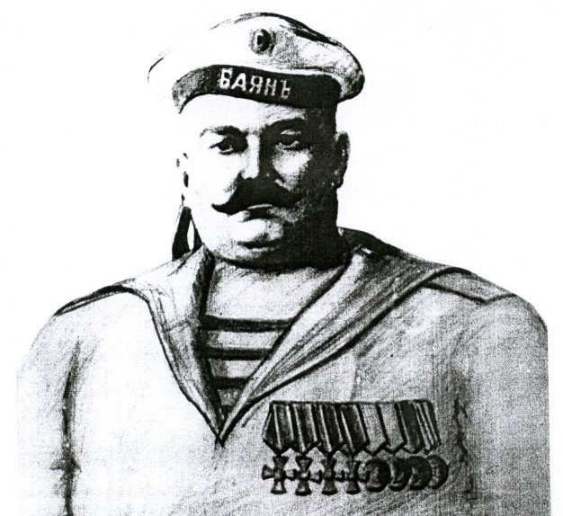 Новиков-Прибой так описывает эту сцену: «…появился среди команды, огромный, худой, обросший чёрной бородой, в нательной рубахе и чёрных брюках. Опираясь дрожащими руками на костыли, он остановился и взглянул в сторону кормы, – там на гафеле развевался японский флаг. То же самое он увидел и на других броненосцах. Судорога передёрнула его лицо с крупными чертами, брови вросли в переносицу, как два чёрных корня. Задыхаясь, он выкрикнул срывающимся басом: "Братцы! Как же это получается? Я защищал первую эскадру. А начальство приказало потопить её. Потопили суда на таком мелком месте, что японцы теперь, вероятно, уже подняли их. Я стал биться за порт-артурскую крепость, живота своего не жалеючи. Получил в сражении сразу восемнадцать ран от осколков разорвавшегося снаряда. Можно сказать, побывал на том свете. А начальство сдало Порт-Артур японцам. В Сингапуре я назвался охотником на эскадру Небогатова. А её также сдали в плен. Да что же это такое творится?"»