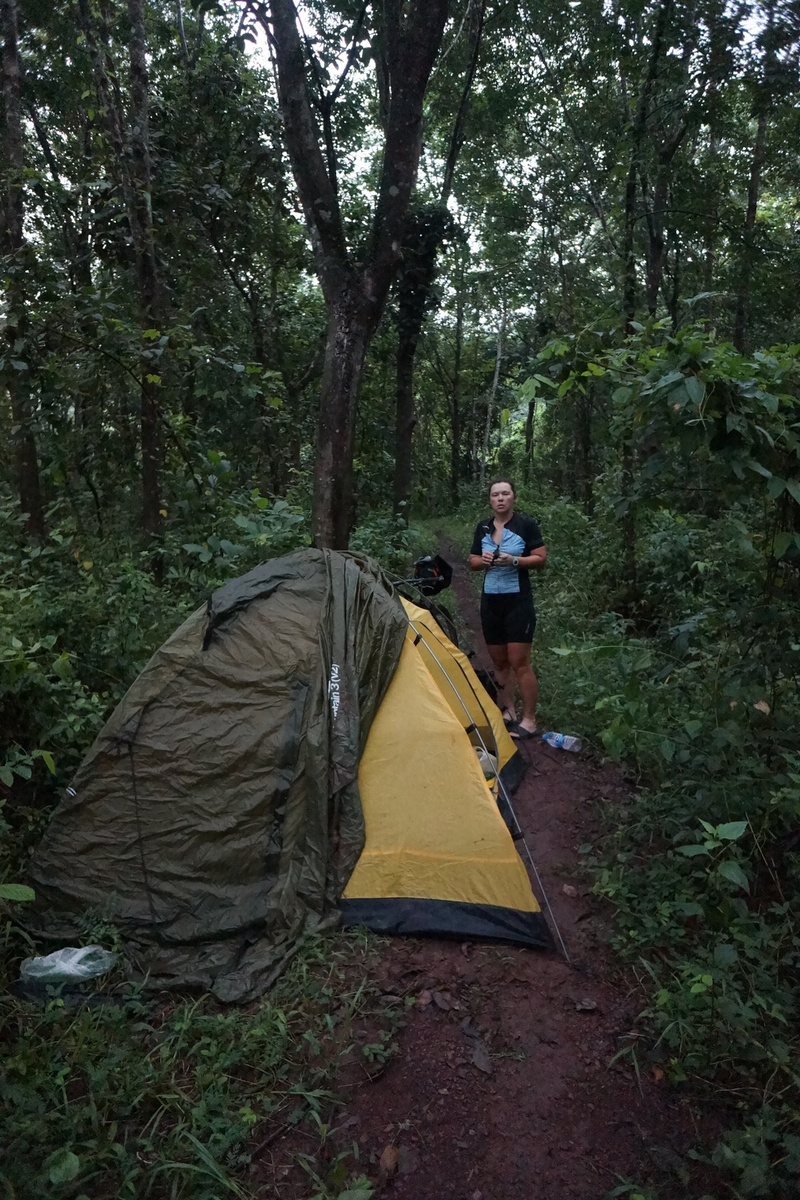 2 октября. День 7. Трек Наше самопальное укрытие справилось, хоть палатка вся мокрая, но внутрь ничего не затекло и ничего с потоками воды не унесло. Утром местные уже давно разъезжали по тропе, по той которая на развилке шла левее. Тент и палатку в дебрях не просушить, распихали по сумкам мокрое. Уж очень не комфортно было находиться посреди зарослей и мы как можно скорее вышли к дороге, дособирать все там. Сегодня облачно и впереди второй "перевал". Воздух комфортной температуры - около 28 гр. Вдоль дорог буйство зелени. Примерно на абсолютной отметке 600 м начало появляться "молоко". Ну вот наш и температурный апогей. Цифра на велокомпьютере была совершенна невероятная для нас всего каких-то пару дней назад - 21 градус! Мы доехали до верхней точки. Здесь Другой Хайнань! Саша наслаждался холодом, а мне как особо потливой было не комфортно находится в мокрой майке. При спуске я немного околела и на очередной смотровой оделась. Здесь мы перекусили лапшой и помчали вниз. При спуске нео