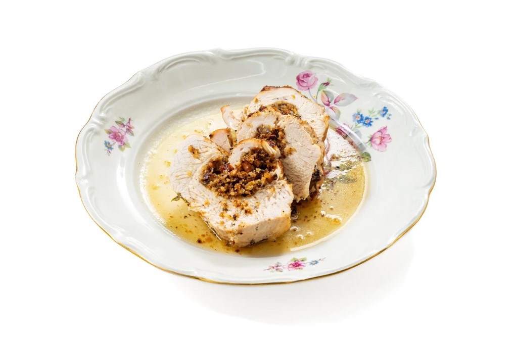 Ингредиенты Сливочное масло 60 г Репчатый лук 1 головка Панировочные сухари 50 г Фисташки 30 г Лимонная цедра 5 г Лимонный сок 60 мл Тимьян 9 веточек Грудка индейки 2 кг Соль по вкусу Молотый черный перец по вкусу 1.Подготовить все ингредиенты. Разогреть духовку до 180 градусов. 2.Выложить фисташки ровным слоем на противень и отправить в духовку на 7 минут. 3.Очистить фисташки от шелухи и некрупно порубить. 4.Снять с 3 веточек тимьяна листья и измельчить. 5.Нарезать лук мелкими кубиками. 6.Растопить половину сливочного масла на среднем огне. Обжарить лук до мягкости. 7.Добавить к луку панировочные сухари, фисташки, лимонную цедру, 2 столовые ложки лимонного сока и половину измельченного тимьяна. Жарить, пока панировочные сухари не станут золотистыми. 8.Индейку обсушить и положить на доску кожей вниз. Положить внутрь начинку, закрутить индейку в рулет и перевязать кулинарной нитью. 9.Выстелить форму для запекания бумагой для выпечки. Положить на дно оставшиеся веточки тимьяна. 10.Све