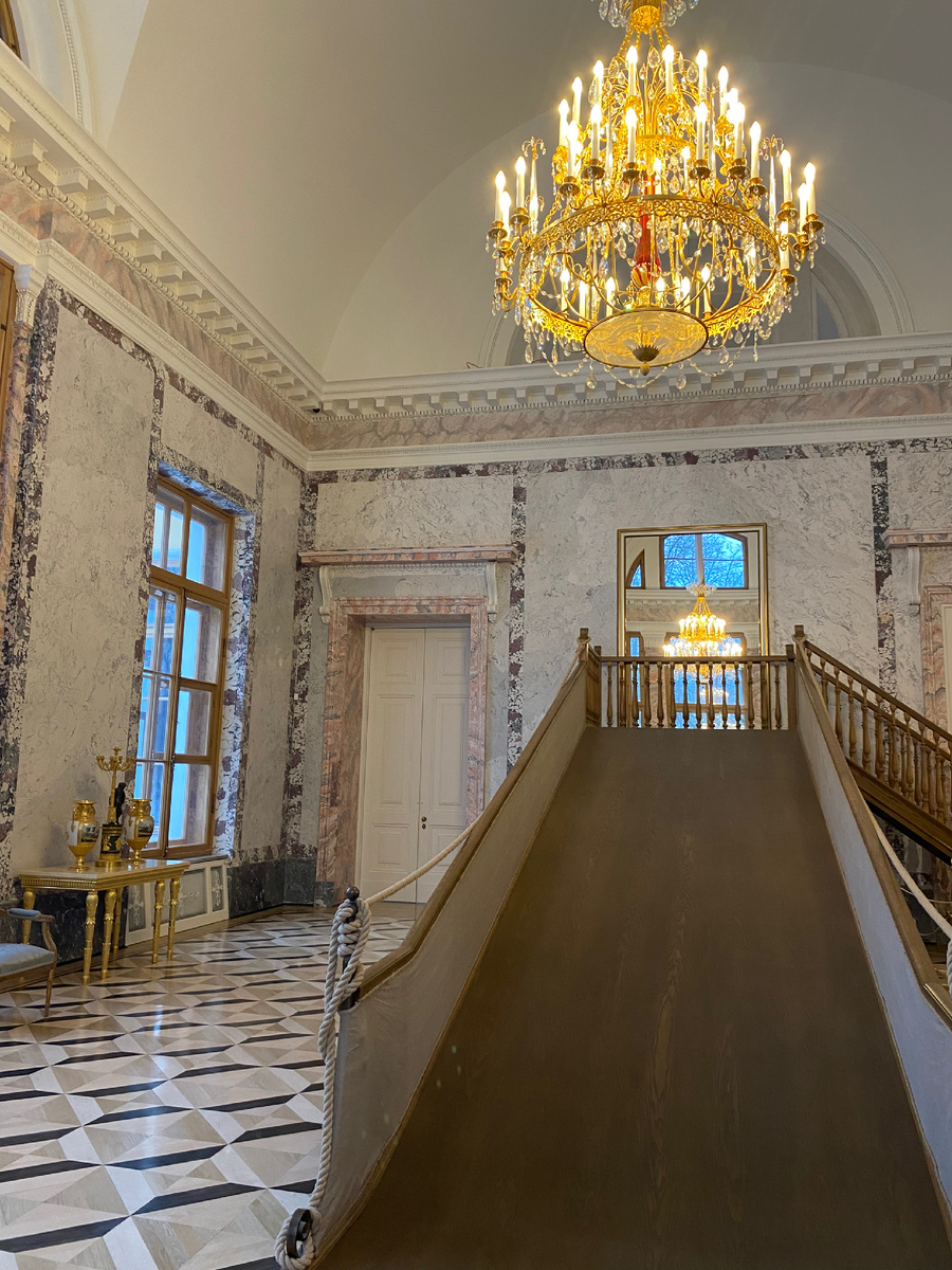 И пятница была хороша, и суббота мне тоже понравилась. Часть пятницы мы провели в залах Александровского дворца в городе Пушкин. Я там уже была, с родители - нет. Но и лично для меня пару новых залов открыли с 2022-го. Например, зал с детской горкой: Сиреневая гостиная - по-прежнему моя любимая комната в этом дворце. Перестановку небольшую сделать, двери для посетителей закрыть - и можно жить. 🤭 Этот дворец уже более современный, чем другие известные мне. Оно и логично, ведь это последний дом царской семьи. Там и телефон, и бассейн, и модерн, а не какое-нибудь устаревшее барокко. Освещение без люстры - очень неожиданный ход в то время. Оттоманка, то есть, простите, диван - 5 на 1,8 метров! Вертолетная площадка. 😀 На выходе, конечно, сувениры: Вход в музей теперь уже 800 рублей для взрослых. В 2022-м было 600, кажется. А может, и 500. Но оно того стоит. Хоть и показывают лишь часть здания, и много чего восстановить всего лишь пока в планах. Будете проходить мимо, заходите. Пото