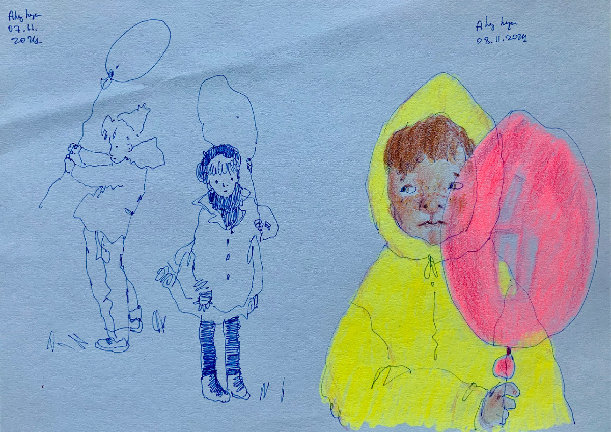 Рисунок синим линером и цветными карандашами. Шарик и куртка малыша раскрашены неоновыми карандашами. Рисунок такими карандашами яркий сам по себе (к тому же камера понимает, что карандаши особенные), но если немного подкрутить яркость и контрастность картинки, она станет еще ярче. Но осторожно! На солнце рисунок неоновыми карандашами может быстро выгореть 🌞