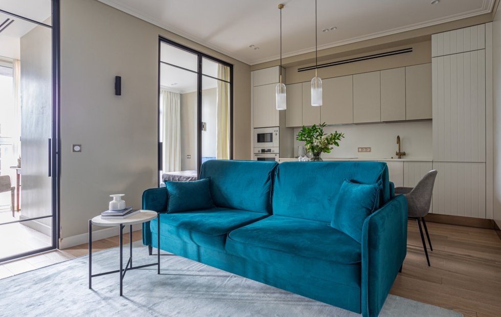 Дизайнер Яна Волкова грамотно спланировала пространство и подобрала стильное цветовое решение Современный стиль в интерьере — это сочетание уюта, четких форм, простоты и свободного пространства. Именно этот стиль выбрала дизайнер Яна Волкова из студии Yana Volkova design для обустройства трехкомнатной квартиры, в которой будут проживать молодая мама и ребенок младшего школьного возраста. Она создала уютную и комфортную обстановку с деликатными бирюзовыми акцентами. Место: Москва Тип дома: Новостройка Метраж: 60 кв. м Застройщик: ЖК «Резиденция архитекторов» Комнаты: 3 Cанузлы: 1 Высота потолков: 2,7 м Дизайн: Yana Volkova design Стилист: Яна Волкова Фото: Михаил Бравый Квартира находится в московской новостройке. Планировку от застройщика изменили, оставив все мокрые зоны на своем месте. Два окна отдали спальням, чтобы они получились комфортными по размеру. В квартире три комнаты: просторная кухня-гостиная, спальня мамы, комната сына. Входная зона плавно перетекает в гостиную. Для отде