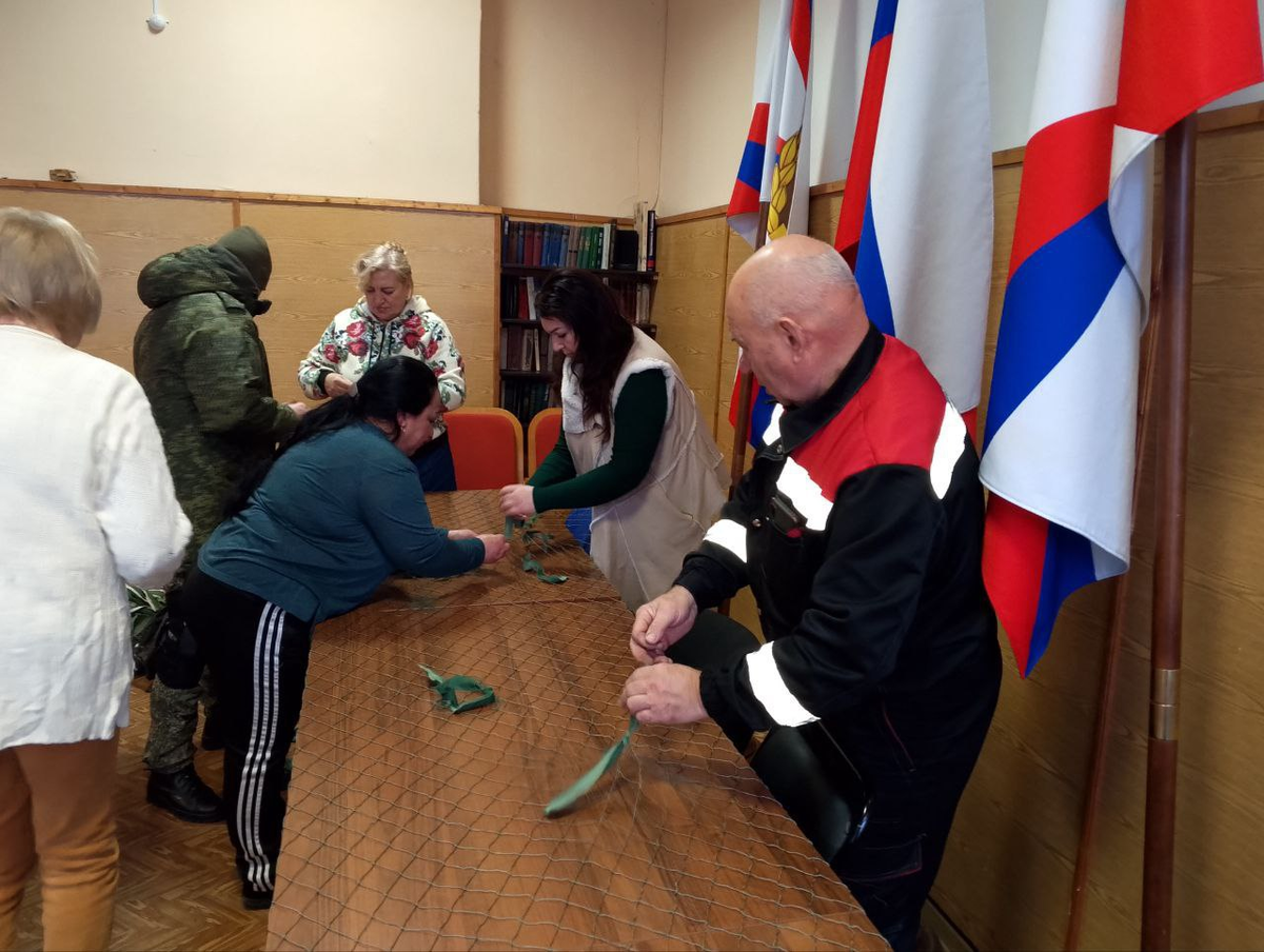 Работники спортивного комплекса (пос. Токсово) Санкт-Петербургского филиала ЦСКА изготавливают для бойцов специальной военной операции маскировочные сети. По готовности маскировочные сети будут отправлены на фронт через штаб тыла добровольческой бригады «Эспаньола».
