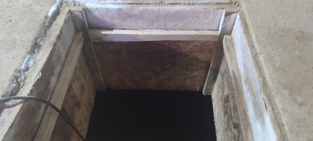 Как ранее писал по процессу заливки погреба и проблемами с влажностью в нём. Нужно было сделать временную крышку люка буквально на зимний период, т.к. начало сильно нарастать изморозь на стенках люка. Просто сколотить из досок вариант не подходил, нужно было сделать небольшую прослойку утепления. Решил просто набить рейку и на неё из остатков OSB плиты сделать щит, потом сверху нарезать пенопласта из остатков и всё это делать притянуть потом к верхнему люку По углам накручивал саморезы чтобы от центровать верхний люк. После сборка все торчащие саморезы либо выкрутил либо посрезал. Возникла новая проблема, если люк сейчас плотно стал закрывать, а до этого я просто спускал удлинитель и запитывал вентилятор. То практически неделю люк был закрыт и вентиляция работала своими потоками, этого не хватало и влажность опять выросла до 99% и весь потолок покрыт каплями конденсата. Если включить небольшую тепловую пушку и включать принудительную вентиляцию, то влажность за час начала падать Сам