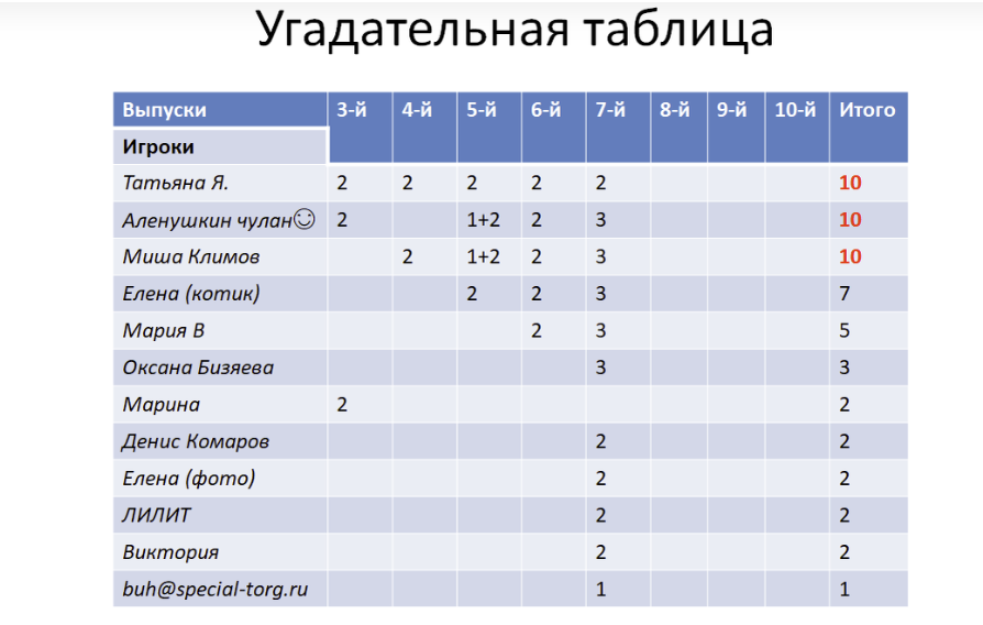 Я точно не знаю, сколько всего намечается выпусков (таблица примерная), но у нас уже наметились лидеры. Хотя всё в любой момент может поменяться.