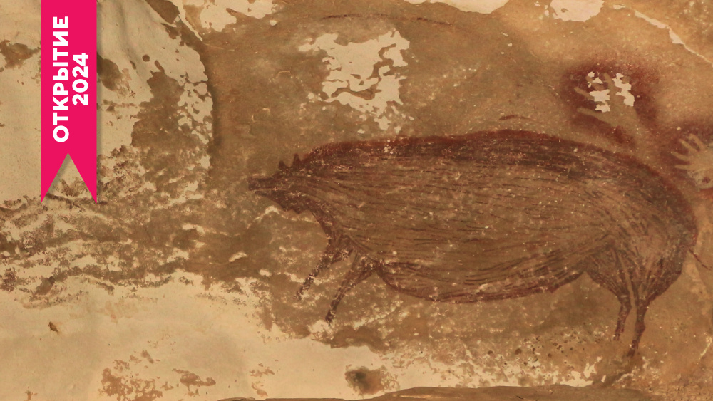 Большую рыжую свинью в окружении трех человекоподобных фигур нарисовал палеолитический человек не позднее чем 51 200 лет назад в пещере на индонезийском острове Сулавеси. Новые методы датировки в 2024 году позволили выяснить, что это изображение является древнейшим произведением искусства на нашей планете. Такое открытие стало сенсацией сразу в нескольких отношениях. «Самое любопытное — то, что в принципе мы видим на Юго-Восточной конечности Евразии пещерные изображения. А их мы долгое время считали исключительно принадлежностью высокой культуры и эпохи верхнего палеолита Европы. И вдруг — вот такие старые, такие ранние датировки. Они, конечно, вызывают изумление, но здесь нужно быть очень осторожными», — доцент кафедры археологии исторического факультета МГУ, д. ист. н. Владислав Житенев. Речь идет о сложности методов уточнения даты. Рисунок очень пострадал от времени. На общем фото охристую свинью еще можно разобрать, а человекообразные фигуры становятся понятны только на детальных